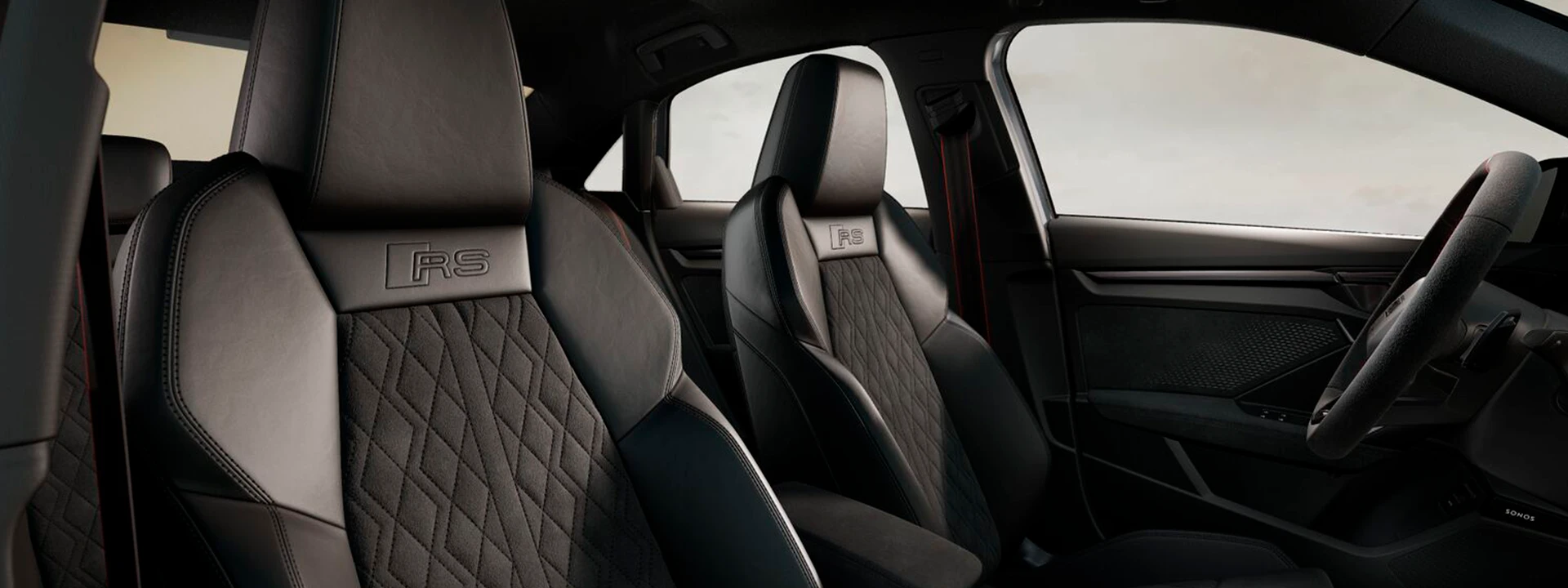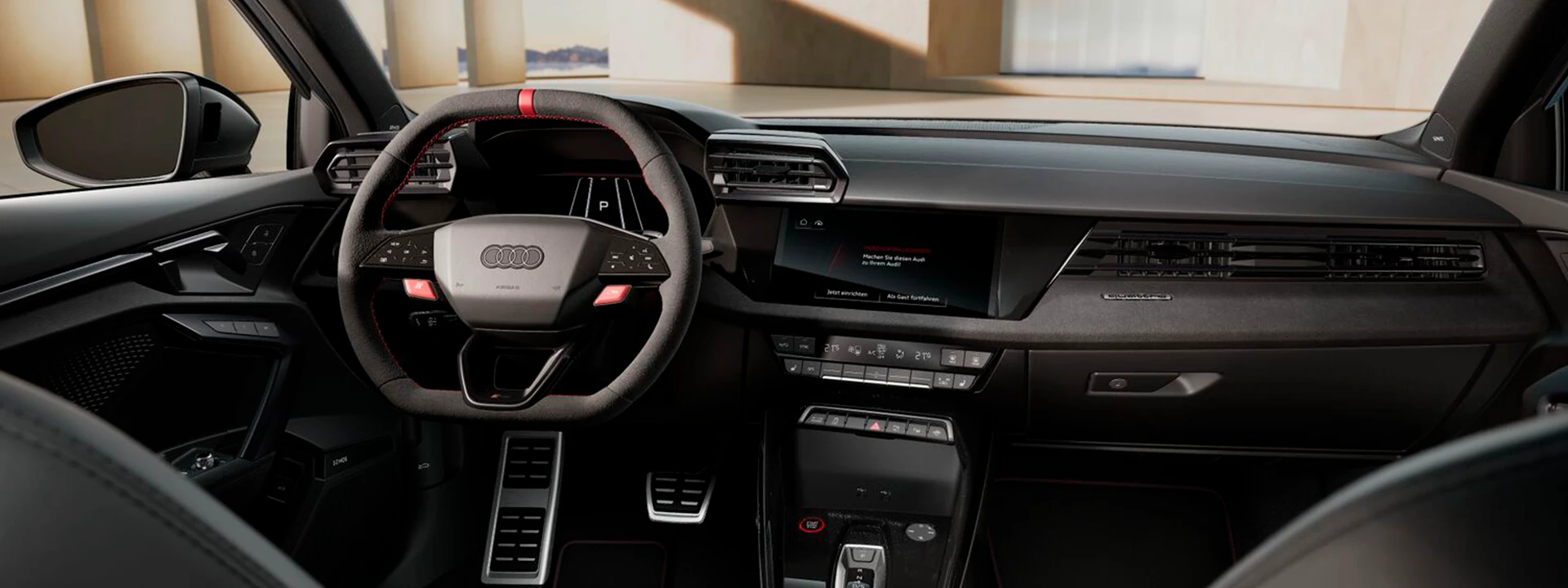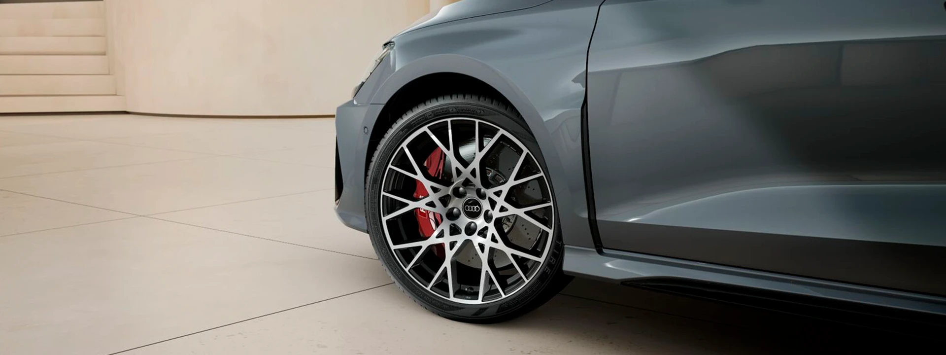 O interior é visivelmente esportivo com o pacote de design RS Vermelho, bancos dianteiros esportivos e volante esportivo achatado. A abordagem da dinâmica de condução também é claramente visível no Audi virtual cockpit plus com um design dos modelos RS selecionável.